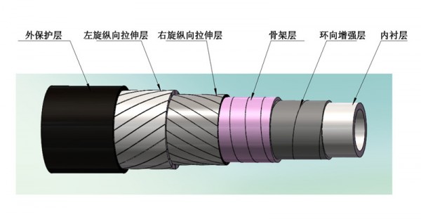 層、右旋縱向拉伸層、左旋縱向拉伸層、外保護(hù)層組成。各結(jié)構(gòu)層之間非粘結(jié),允許層間相對(duì)運(yùn)動(dòng)。通過